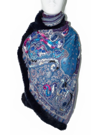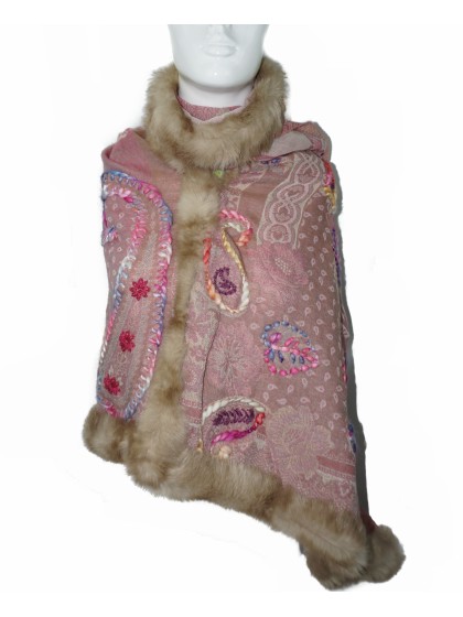100% Indian fine woolHandmade details195x70 cmUnique designs and patterns Can be worn in many different ways Rabbit Fur trim on three sides Perfect for cooler days and evenings..